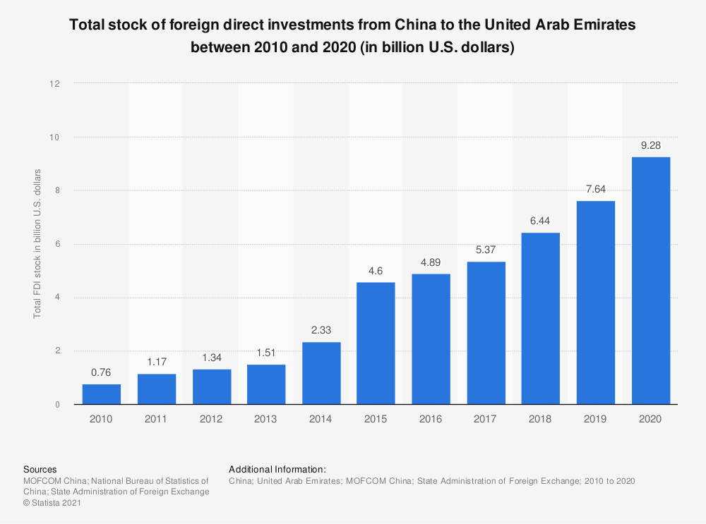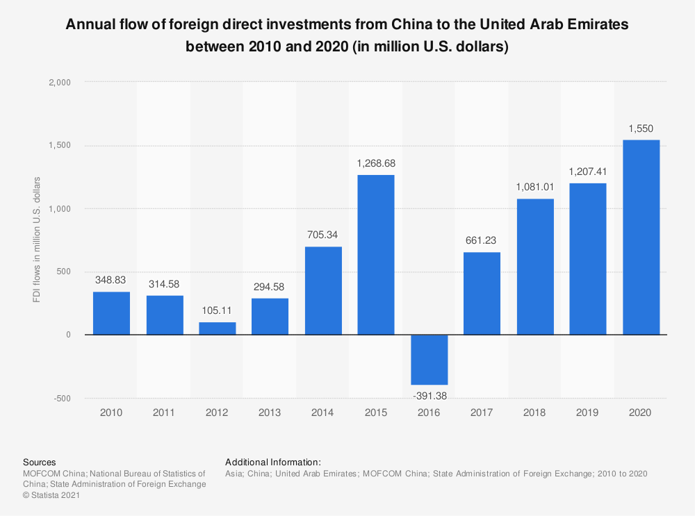 We further note that annual flow of foreign direct investments from China to the UAE has increased from USD 348.83 million in 2010 to USD 1.55 billion in 2020, while total stock of foreign direct investments from USD 760 million to USD 9.28 billion for the same period.