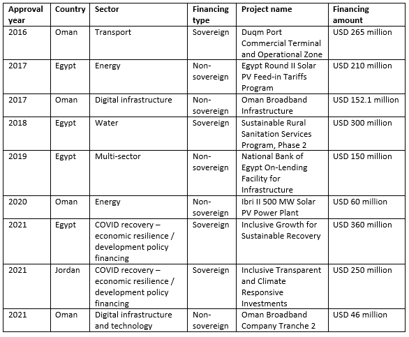 As a formal operational agreement is being put in place, it is worth mentioning that the bank’s developing portfolio already includes 181 projects in 33 countries worth USD35.7 billion. We highlight some of AIIB’s notable approved projects in the Arab world below, which excludes multi-country projects: