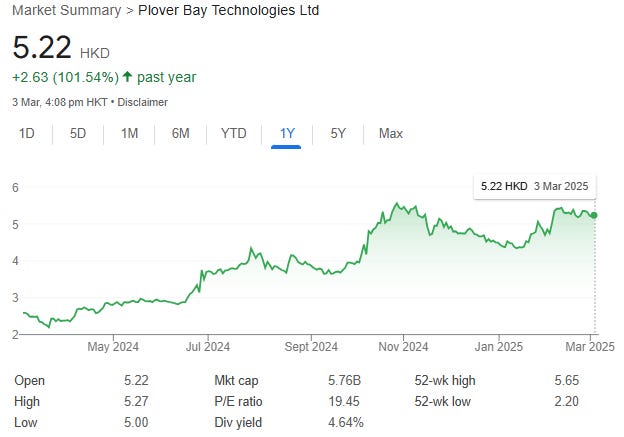 Full disclosure: We hold shares in Plover Bay Technologies (1523.HK).