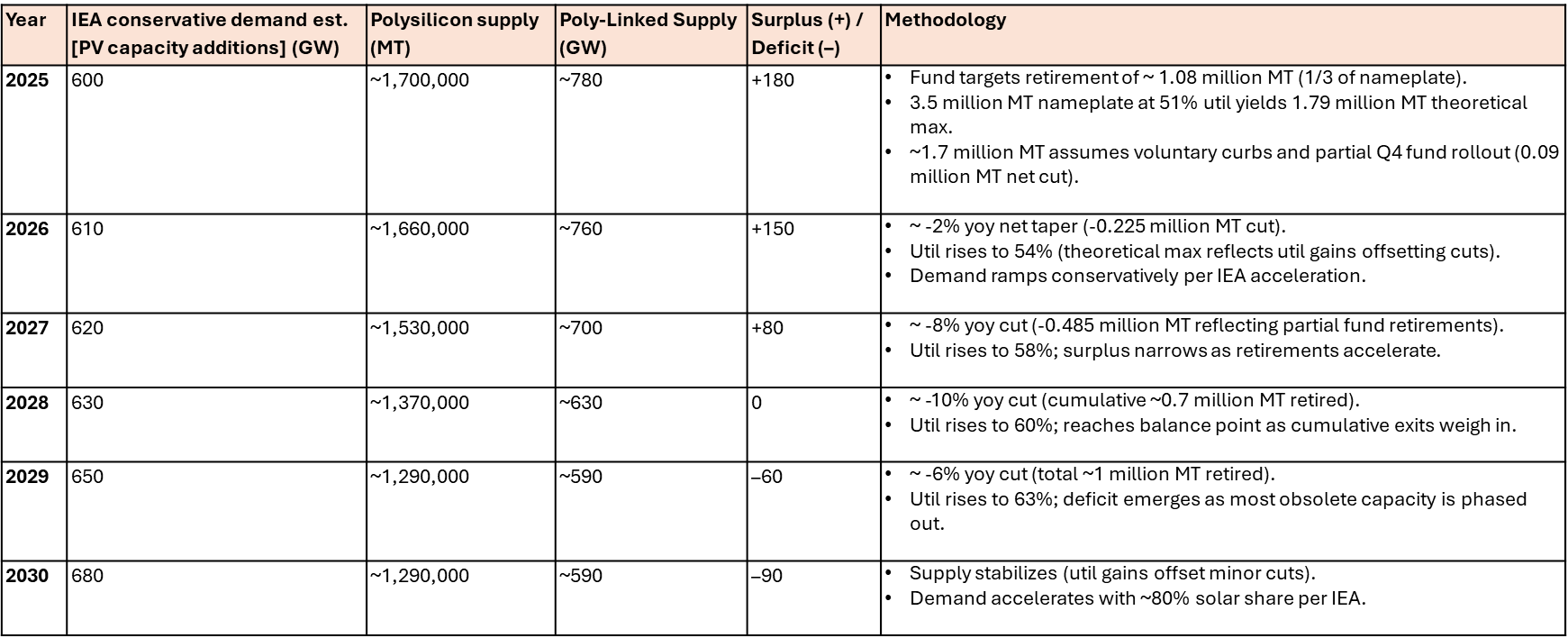 Based on our adapted estimates, we tend to align with the view that mild oversupply is anticipated to linger through 2027, with poly-demand convergence expected by 2028, preceding full module resolution, with potential shortfalls in 2029-2030 should demand accelerate, with upside coming from the Global South and stalled production investments. The key risks to this are the delayed rollout state-led of capacity restrictions, US Uyghur Forced Labor Prevention Act (UFLPA) tariffs and slower adoption if the cost of traditional fuels falls further.