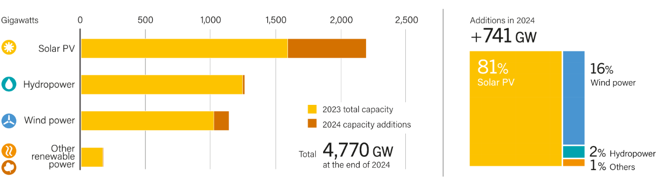Global cumulative solar photovoltaic (PV) capacity surged from around 230 GW in 2015 to over 2,200 GW by end-2024, a CAGR of about 29% and nearly a tenfold increase in a decade. Recent years have been even more dramatic: Annual additions in 2023-2024 matched or exceeded the entire global fleet from just a few years prior.