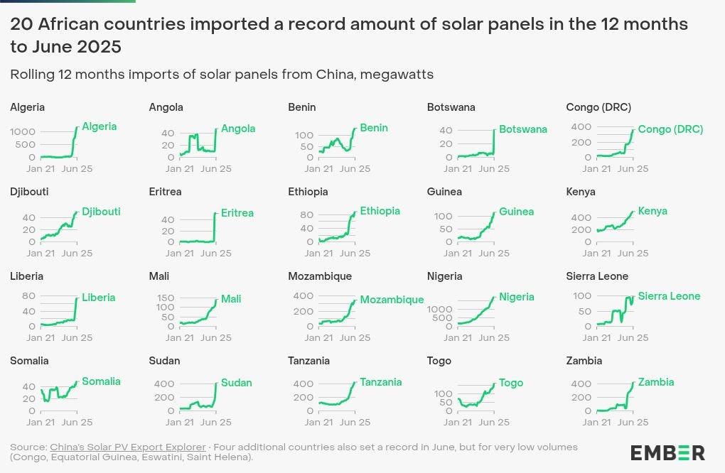 Africa’s growth is only just picking up, and the trajectory may prove even more striking. Imports from China were up 60% yoy in June 2025. The continent added 12x more solar in 2023 than the prior decade’s total, with rooftop installs doubling and utility projects booming. With 600 million lacking electricity, USD 5.7 billion in financing (up 50% yoy), and costs down 80% in 18 countries via tenders, solar could grab 40% of Africa’s USD 100 billion energy spend by 2030.