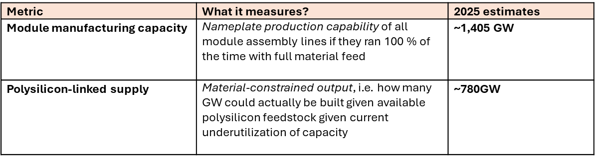 But in practice, it’s much lower (~780 GW) due to polysilicon factories shuttering production capacity amid oversupply. To forecast when supply and demand align, it’s best to think in “polysilicon-equivalent GW”, focusing on this upstream constraint rather than downstream factory hype.