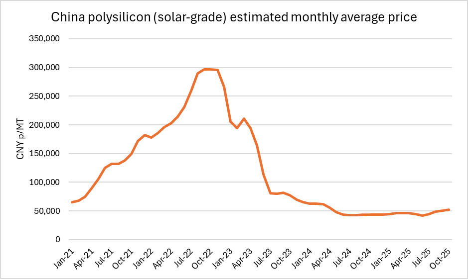 This glut crushed polysilicon prices, falling dramatically from over ~ CNY 200,000 (~USD 28,000) p/MT in early 2023 to ~ CNY 42,000 (~USD 5,900) p/MT mid-2025, before rebounding to CNY 52,000 (~USD 7,300) p/MT as of October 2025. Chinese firms have been forced to dump below cost amid expanding polysilicon capacity and maintain market share, thereby significantly eroding profits.